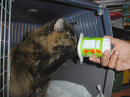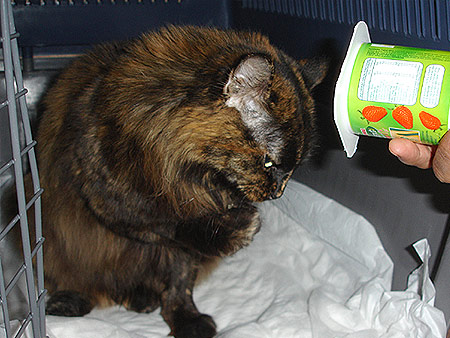 Estoy bastante aburrida y apestada en la jaula… pero tengo mis ratos de disfrute, como cuando humana me da a lamer el vaso de su yogurt diario. Al que yo dedicadamente le paso mi patita, que luego langüeteo.