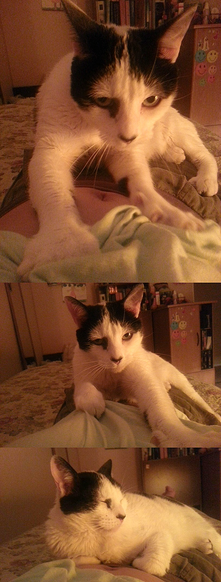 Está haciendo pancito 🙂 Hermoso Dominó, besitos gatunos para ti.
