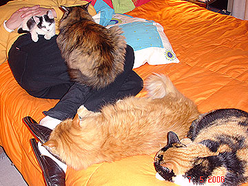 ¡¡¡Ahhh!!! Eso me recuerda hace unas noches atras, que desperte pegada en la pared (mi cama esta en un rincon, al lado de la pared) y con una cosa pesada en mis piernas, eran unas de mis bellecitas (recuerden son 15), doña Mimí, sus tres hijas y su nieta, que dormian placidamente en toda mi cama, y a mí me tiraron para el rincón, y ella, la Mimí, en mis piernas. La Molly no, ella es independiente y duerme en su cunita.