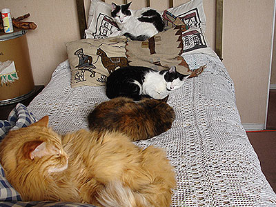 son todos hermosos….. que buen descanso, para reposar la comidita…. y luego volver a jugar y comer, jajaja y otras cosas mas. regalones como mis gatos , nada como dormir en cama de los papis…. saludo a todos los que les gustan los gatos, y animales en general.