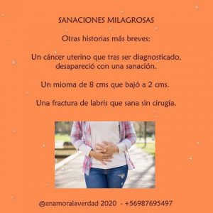 Otras historias más breves:.Un cáncer uterino que tras ser diagnosticado, desapareció con sólo una sanación..Un mioma de 8...
