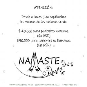 La sesión inicial de comunicación y sanación vale 30 mil pesos (es a distancia). Iremos evaluando de un día a la vez cómo seguimos, pues la situación irá cambiando con el transcurso de los días.