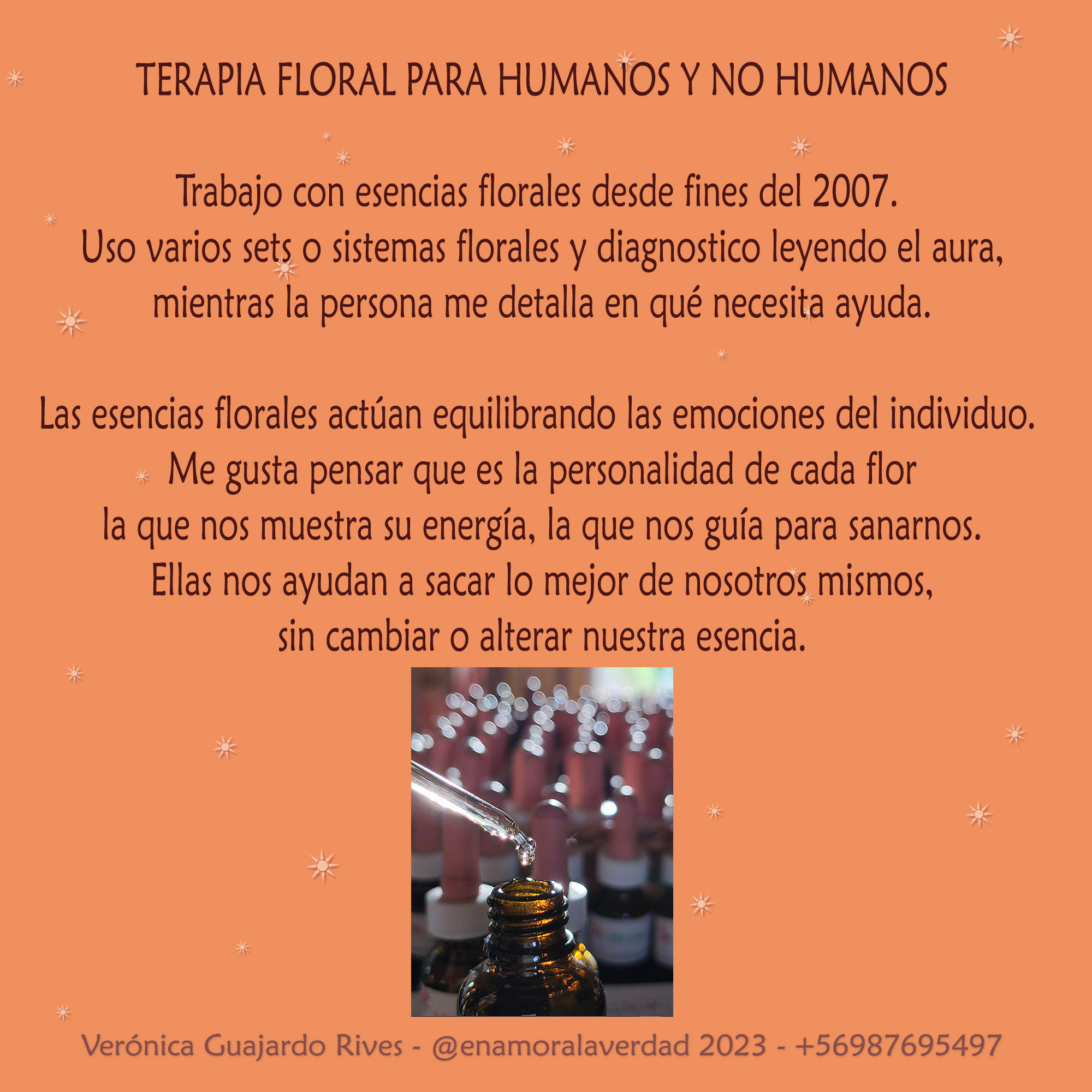 Trabajo con esencias florales desde fines del 2007. Uso varios sets o sistemas florales y diagnostico leyendo el aura, mientras la persona me detalla en qué necesita ayuda.